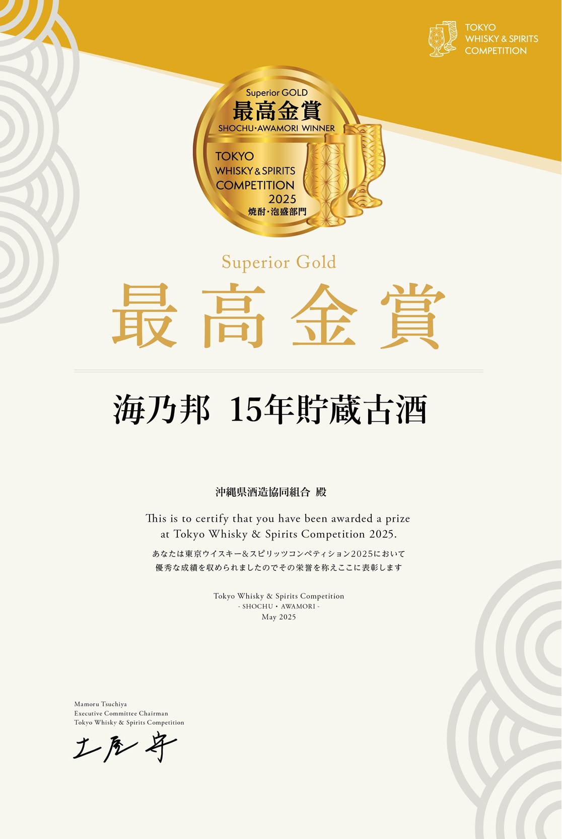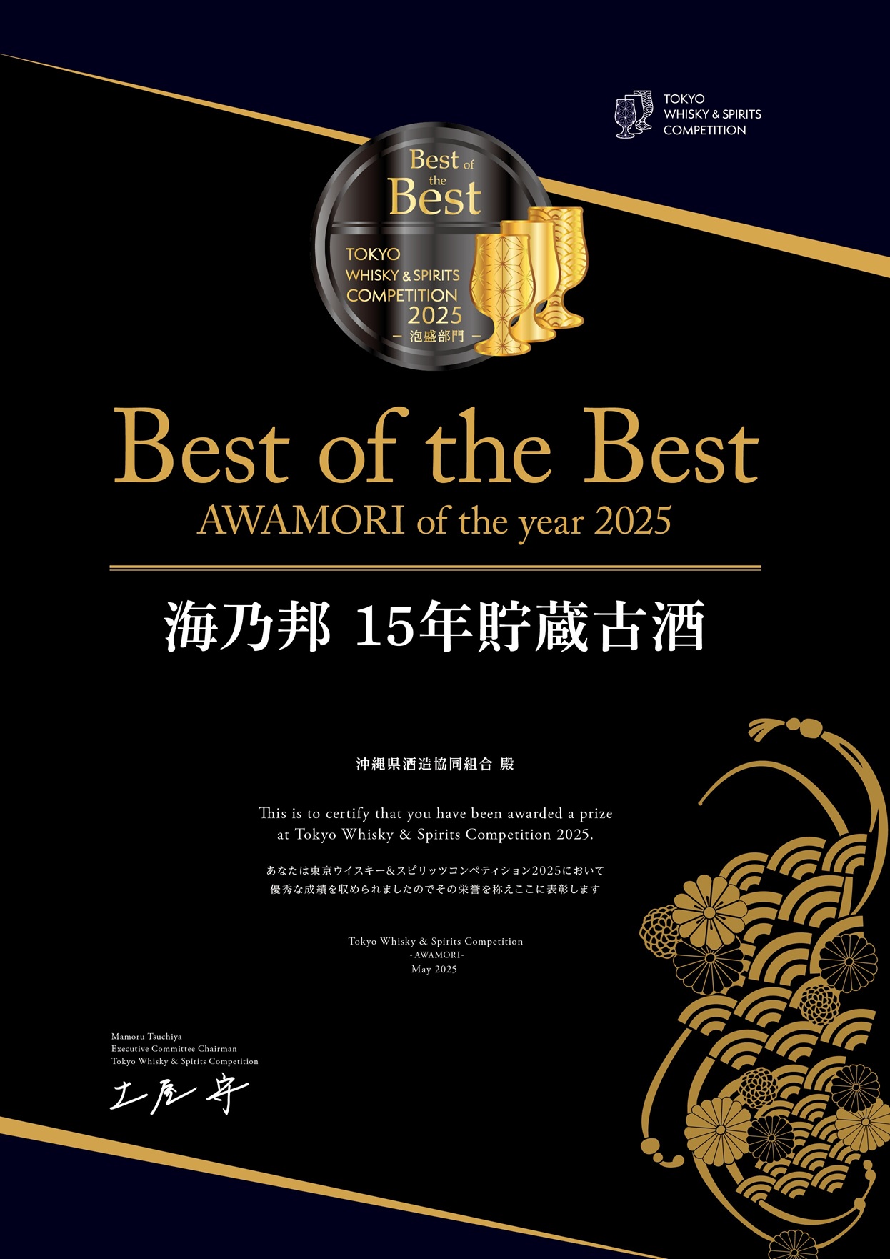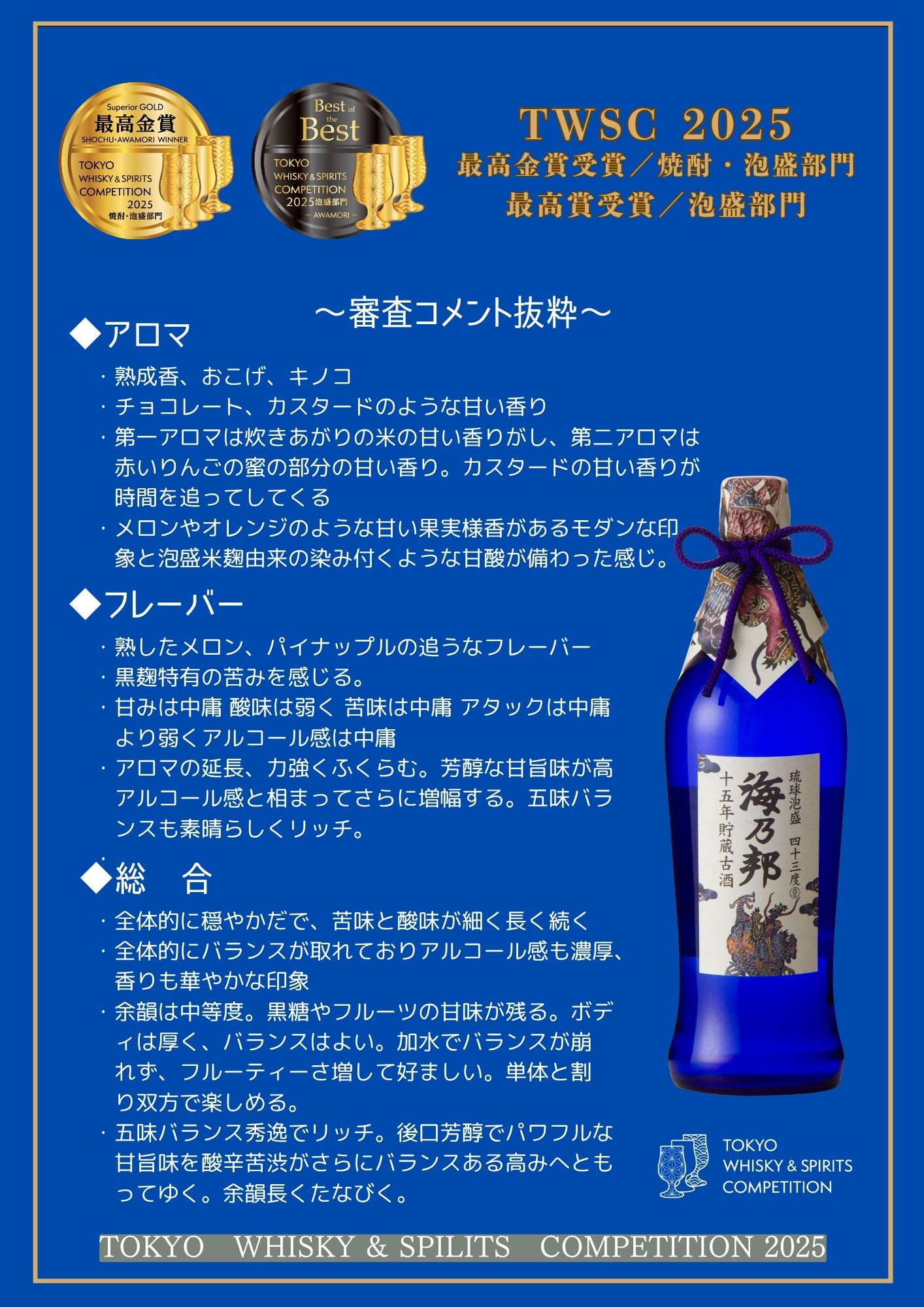 2025年:TWSC2025 最高金賞受賞(焼酎・泡盛部門) 及び BEST OF THE BEST 受賞(泡盛部門)